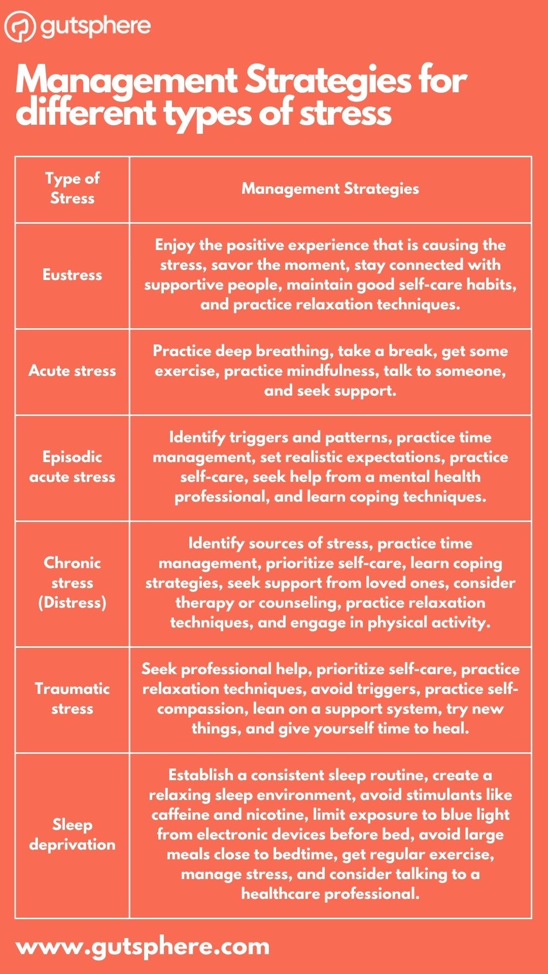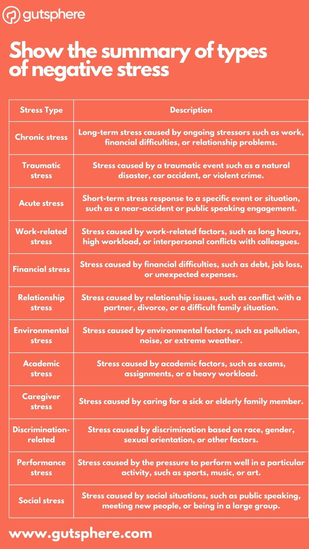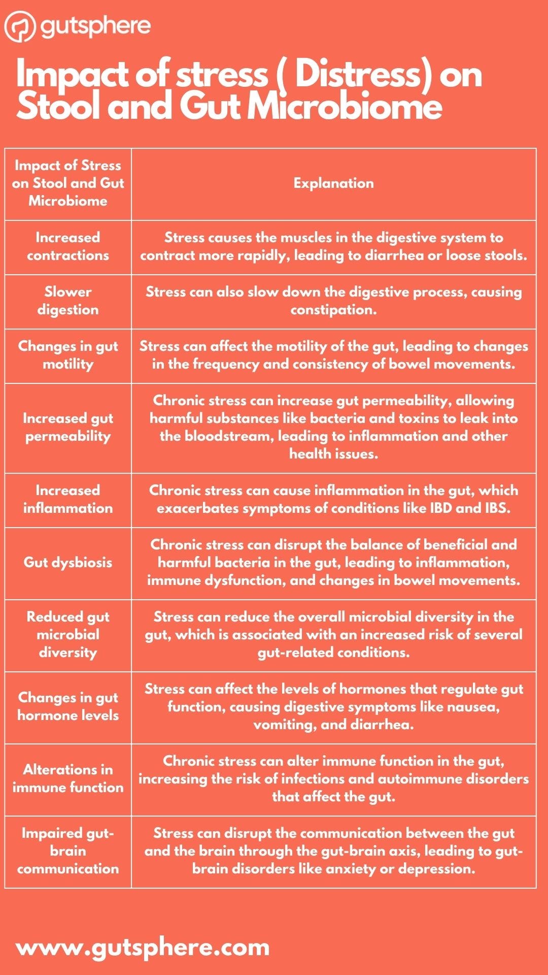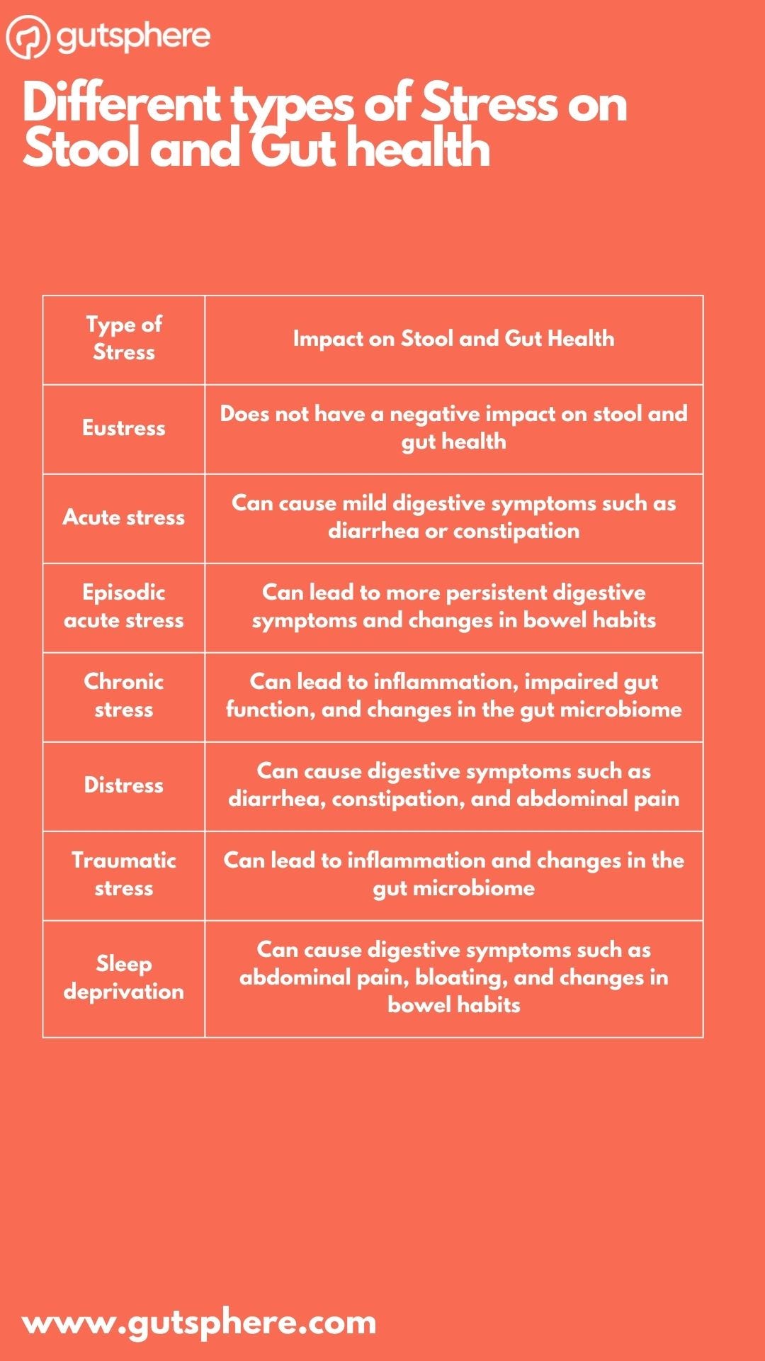 Here's a table summarizing the impact of different types of stress on stool and gut health: