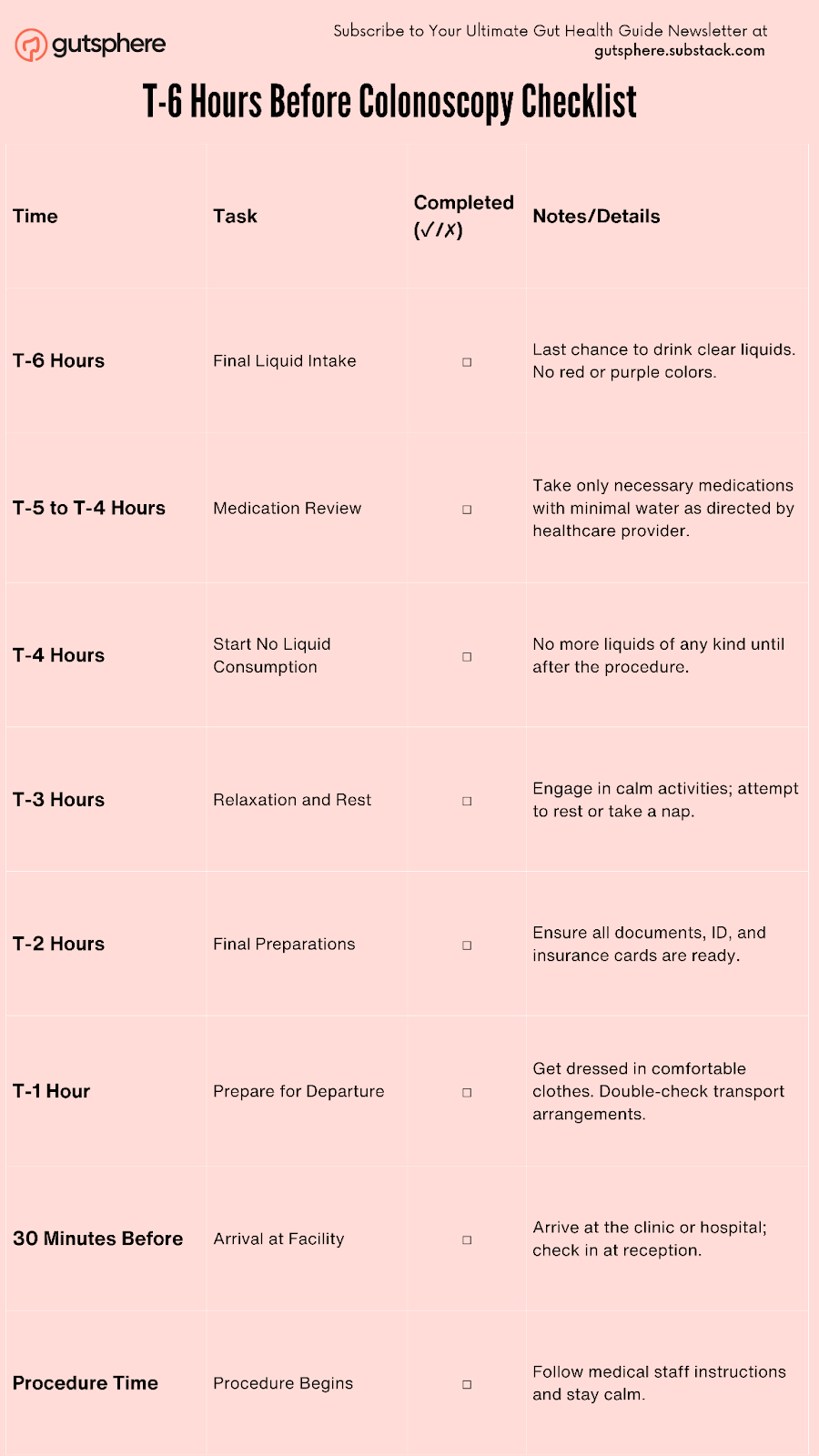 This checklist should be printed and kept handy as a reference during the final hours leading up to the colonoscopy, ensuring a smooth and stress-free preparation process.