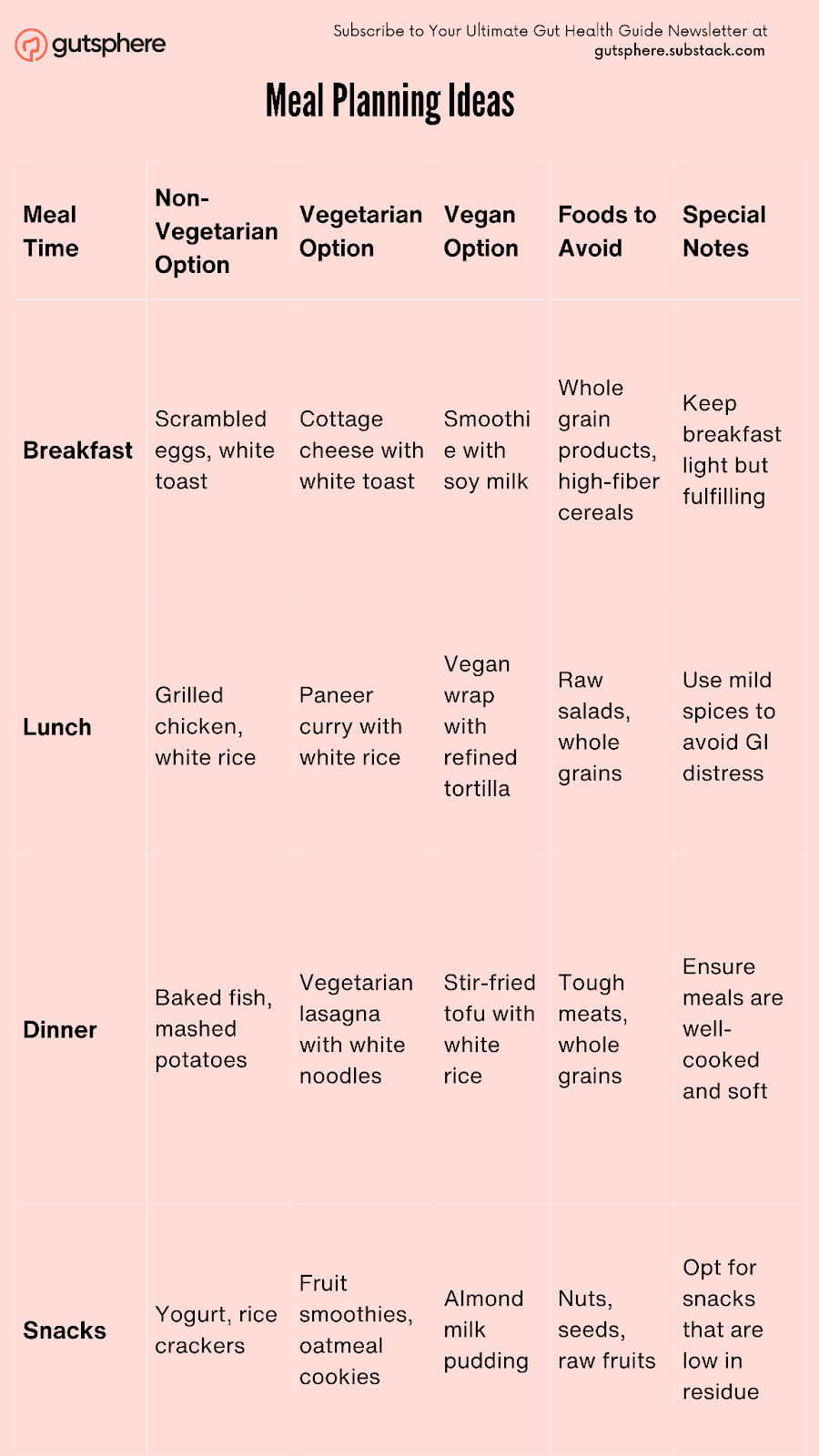 Avoid: Foods that are high in fiber like salads, whole grains, and dishes that include nuts, seeds, or raw fruits and vegetables. Also, steer clear of fried and spicy foods as they can irritate your digestive system.