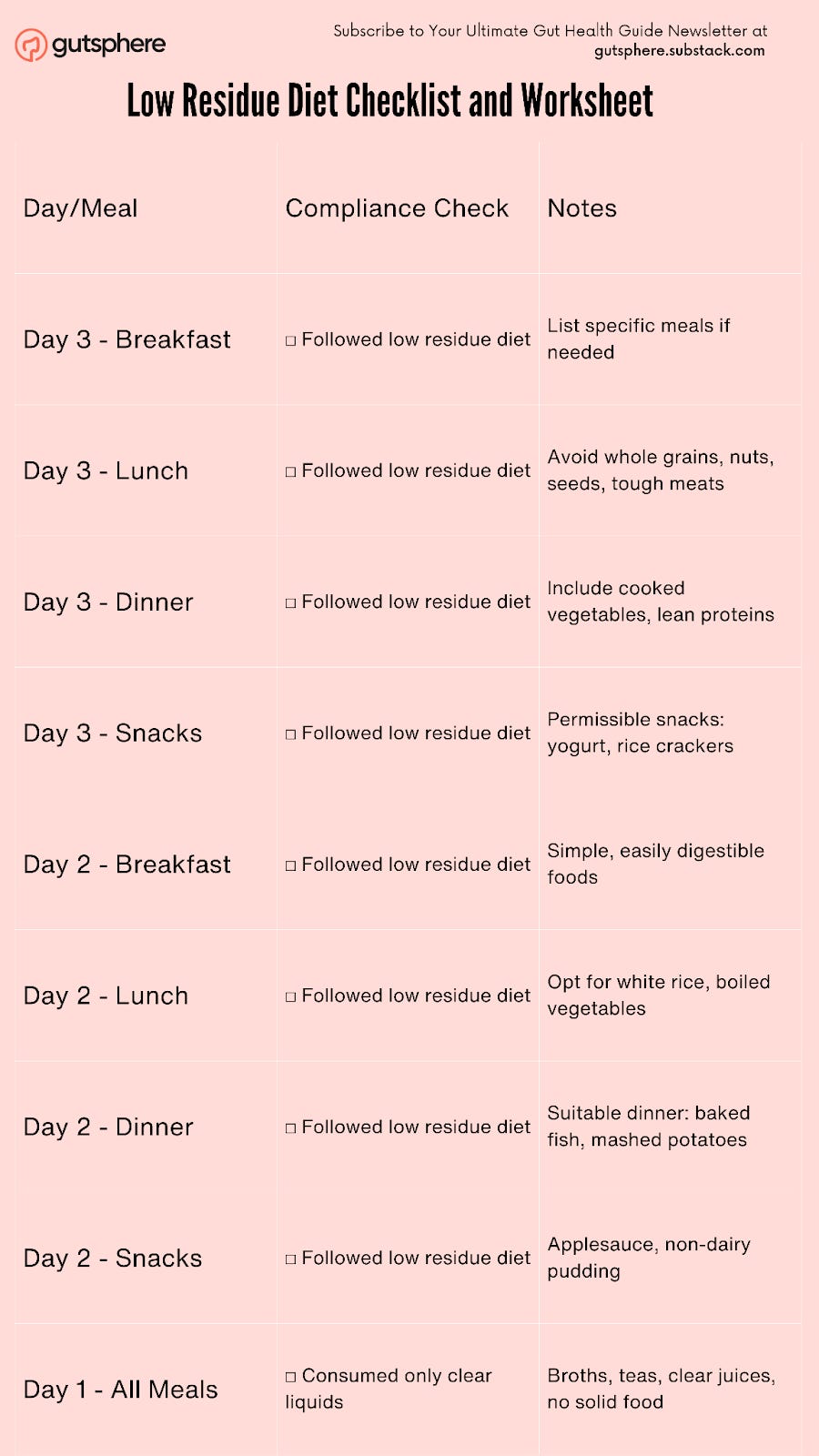 These meal plans are designed to be gentle on your digestive system while keeping in line with the principles of a low residue diet. Remember, the key is to focus on foods that are low in fiber and easy to digest, which helps ensure your colon is as clear as possible for the colonoscopy.
