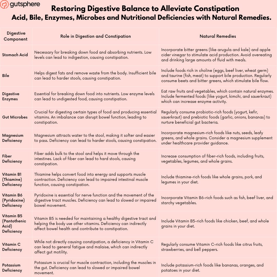 Let’s expand the digestive system a bit more because there are many deficiencies that can cause poor digestion and eventually lead to constipation. We want to talk about in a separate title. Check the title below: Restoring Digestive Balance: Acid, Bile, Enzymes, Microbes and Nutritional Deficiencies with Natural Remedies.