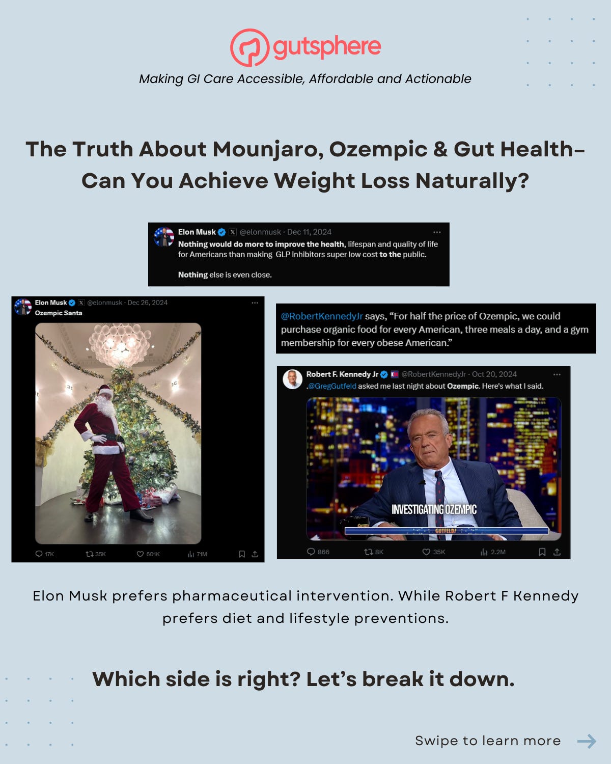 Elon Musk vs. RFK Jr : The weight loss debate Musk credits GLP-1 drugs like Ozempic for suppressing hunger. RFK Jr. focuses on gut health and the microbiome through natural eating. Who is right? Or are they two sides of same coin?gutsphereJan 15, 2025ShareThanks for reading Gutsphere - Simplifying GI Care for Everyone, Everywhere! Subscribe for free to receive new posts and support my work.SubscribePreviousNext