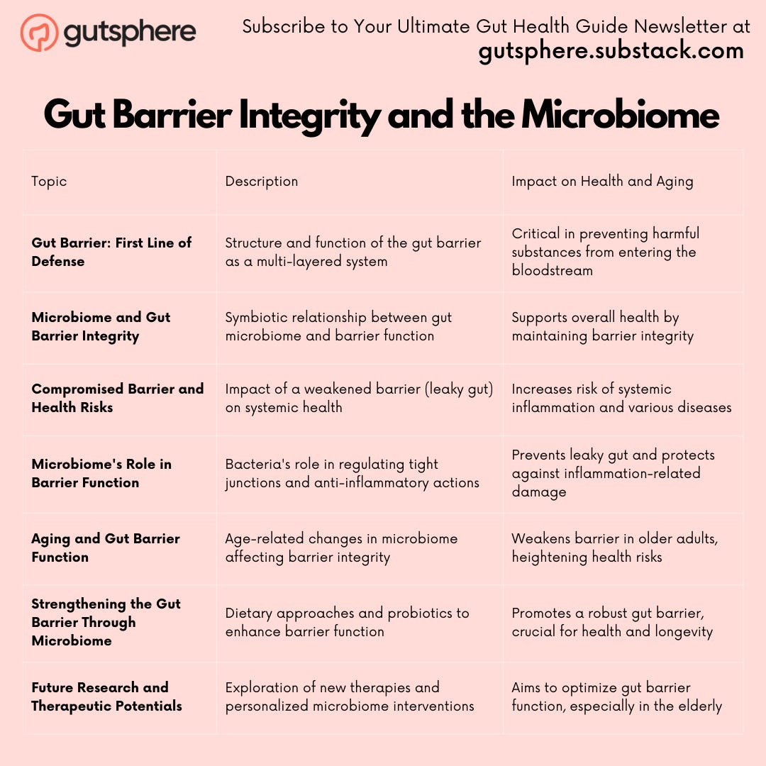 In Summary The integrity of the gut barrier, profoundly influenced by our gut microbiome, emerges as a cornerstone of our health and well-being, particularly in the context of aging. As we continue our journey in understanding the dynamic world of the microbiome, the insights gained in this chapter underscore the potential of targeted interventions and lifestyle choices in fortifying this critical barrier, paving the way for a healthier, disease-resistant life.