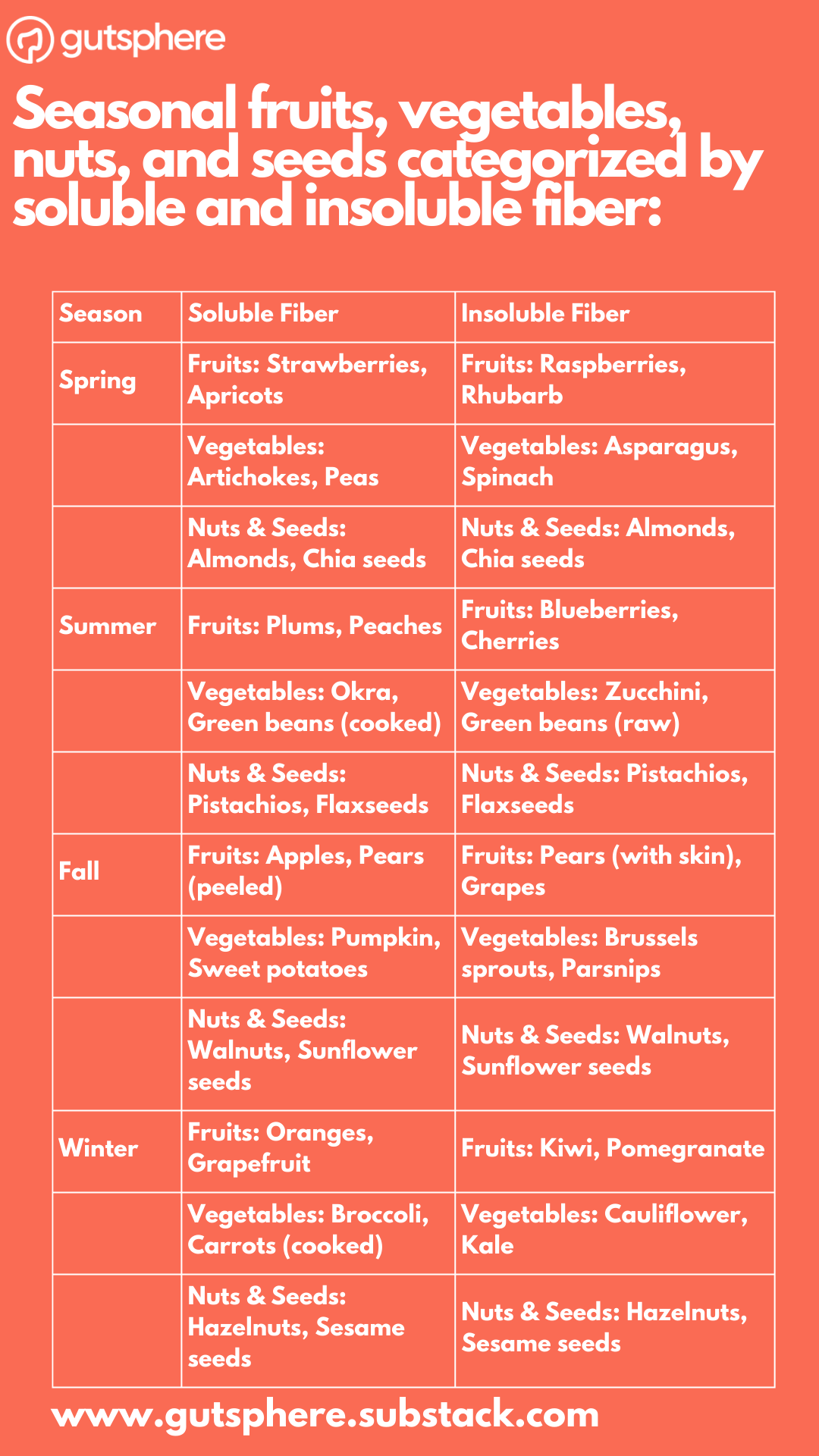 Keep in mind that the availability of these foods can vary depending on your location and local growing conditions. Consuming a diverse range of seasonal fruits, vegetables, and nuts can help ensure an adequate intake of both soluble and insoluble fibers, promoting gut health and overall well-being.