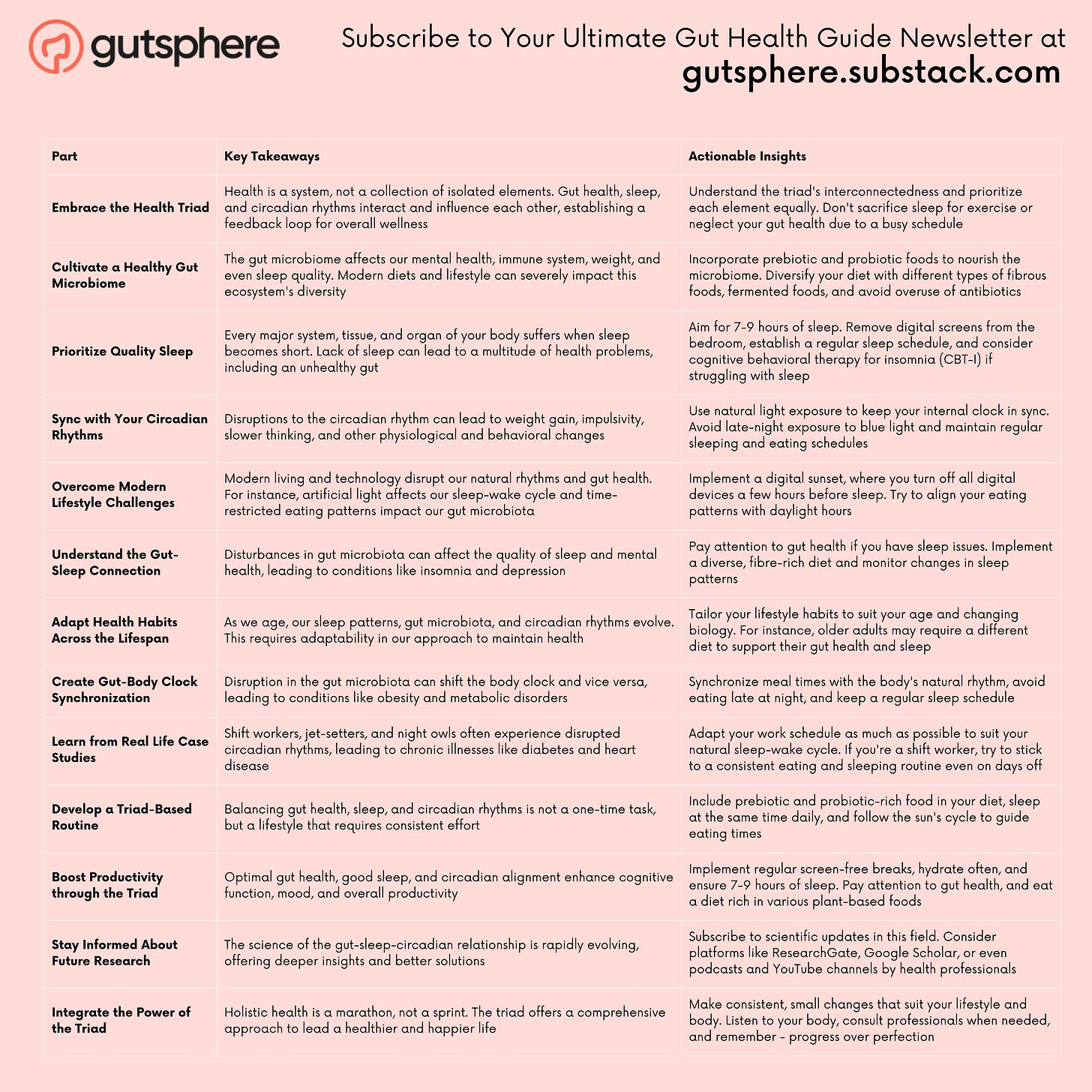 In the tenth part, we provide 'The Perfect Balance: Proven Strategies for Optimizing Our Gut, Sleep, and Circadian Rhythms', offering practical guidance to nurture a thriving gut, sound sleep, and balanced body rhythms.