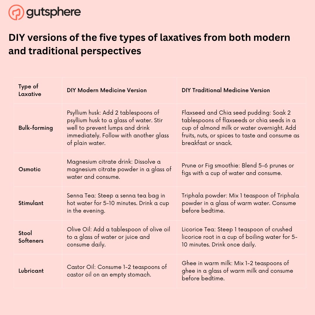 Here's a table summarizing DIY versions of the five types of laxatives from both modern and traditional perspectives: