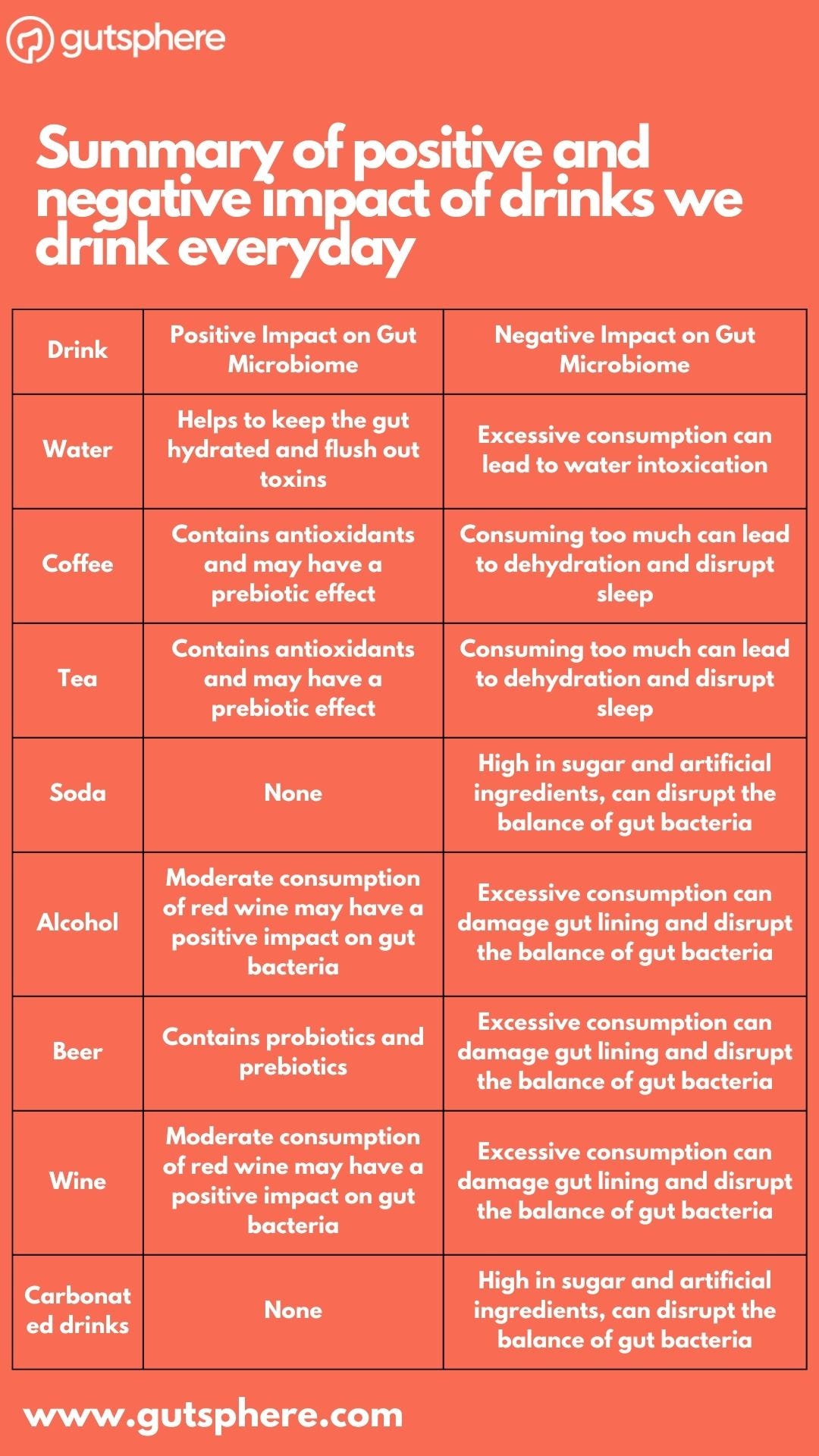 Summary of positive and negative impact of drinks we drink everyday such as water, coffee, tea, soda, alcohol, beer, wine, carbonated drinks on gut microbiome.