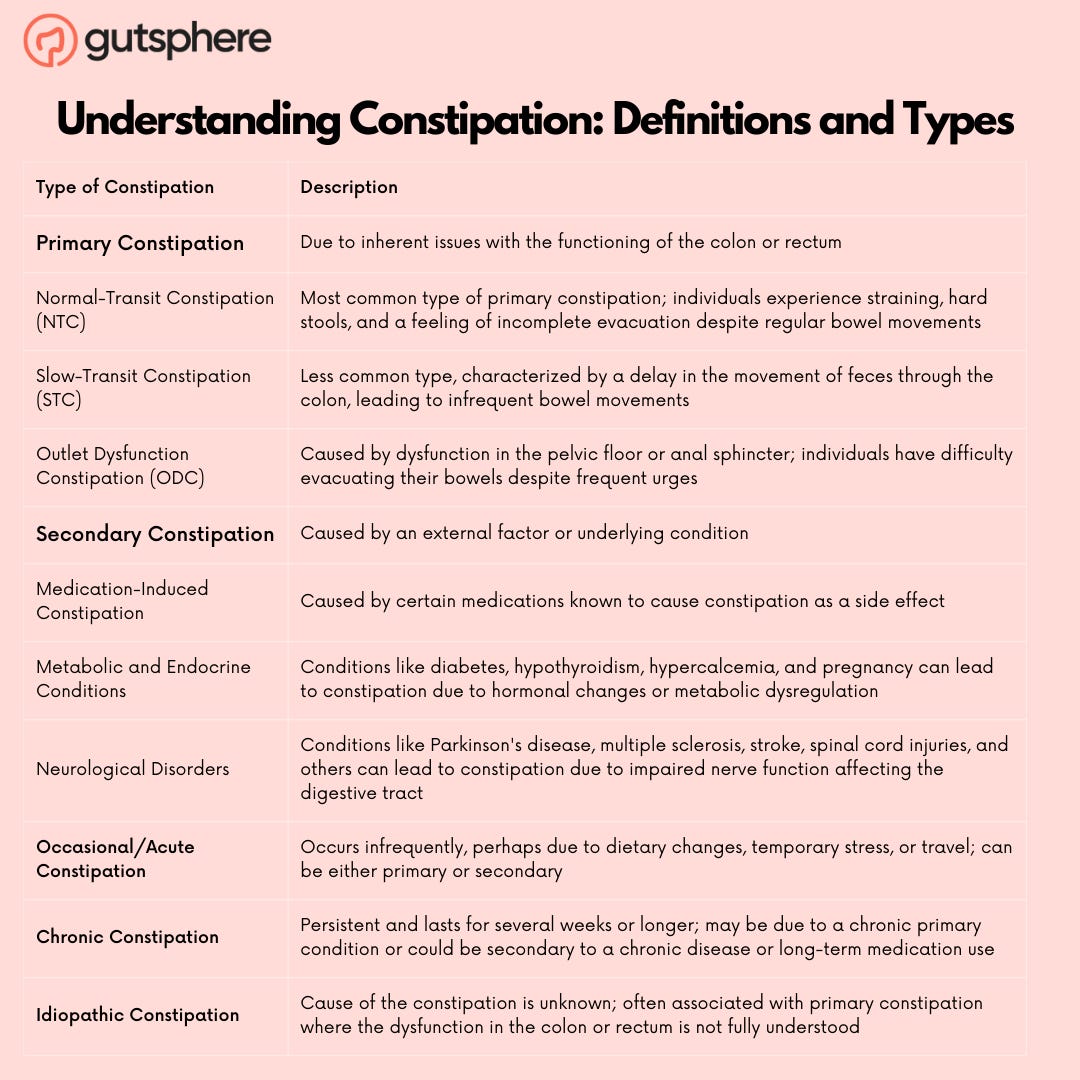 Primary constipation is due to inherent issues with the functioning of the colon or rectum. So, it’s called functional constipation. It's not caused by an external factor or underlying condition, but instead by inherent issues with the colon's structure or function. This type of constipation can be further divided into three subtypes: