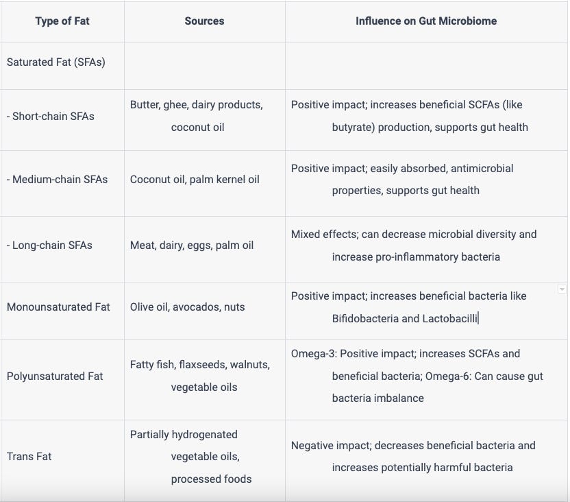 Below is the summary of different types of fat and its impact on the gut microbiome.