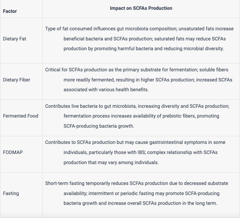 The relationship between dietary fat, fiber, fermented food, fodmap, fasting and SCFAs production