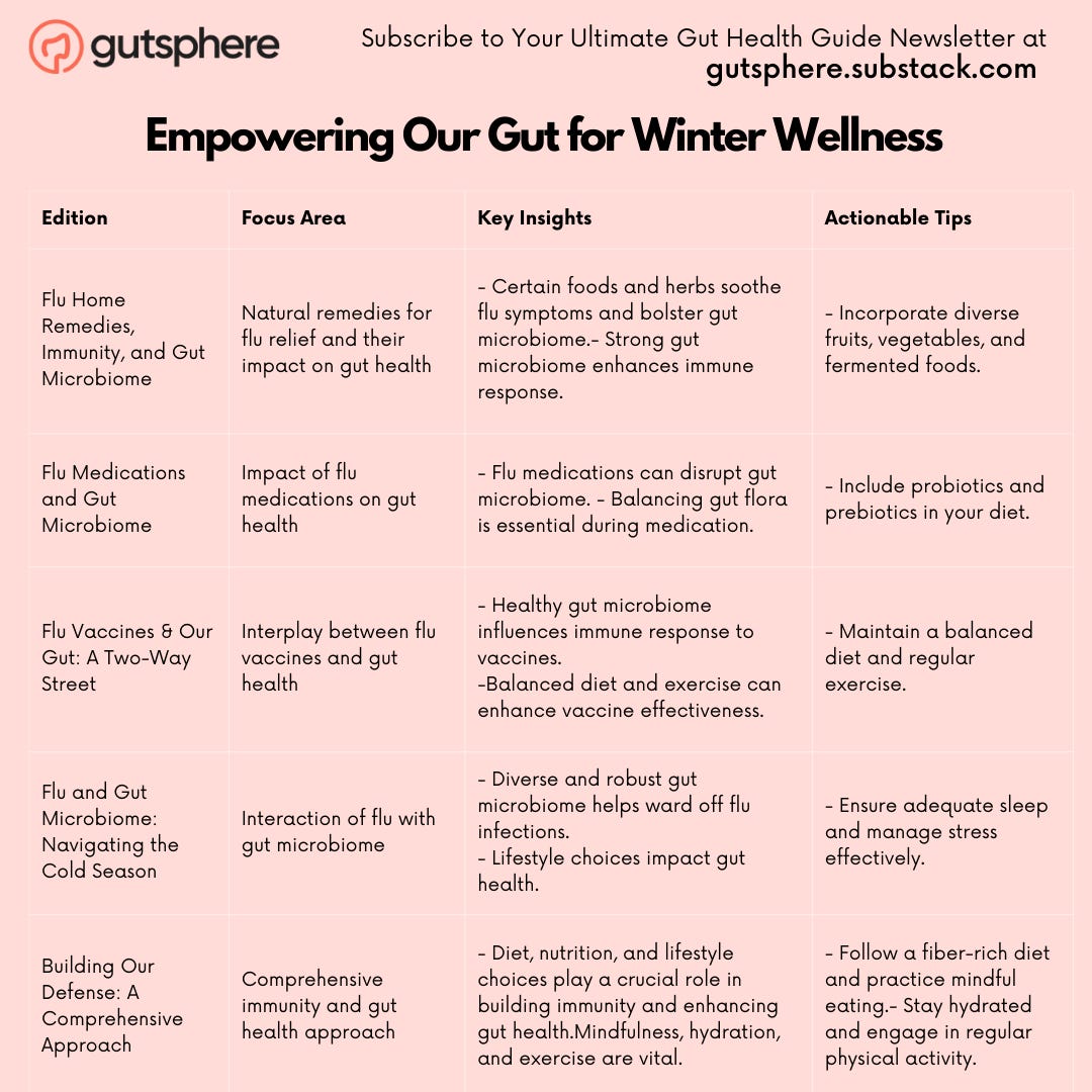 In our final edition of this series, let's take a journey through the fascinating connection between the flu, our gut microbiome, and overall health. Over the last four editions, we've explored various aspects of this relationship, and today, we'll synthesize these insights and provide actionable tips to strengthen our gut health and immunity, especially as we navigate the winter season.